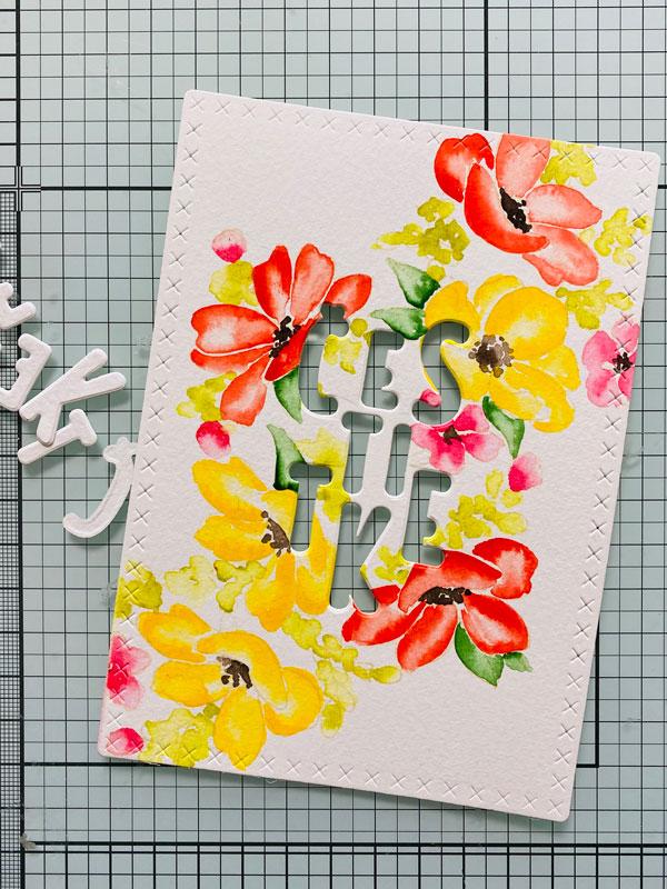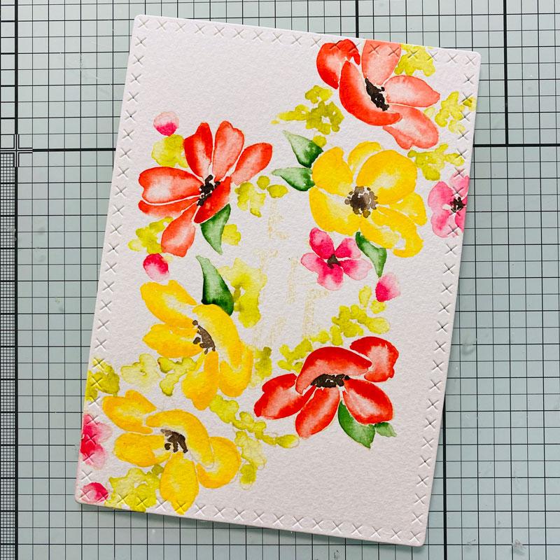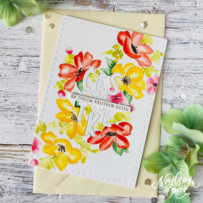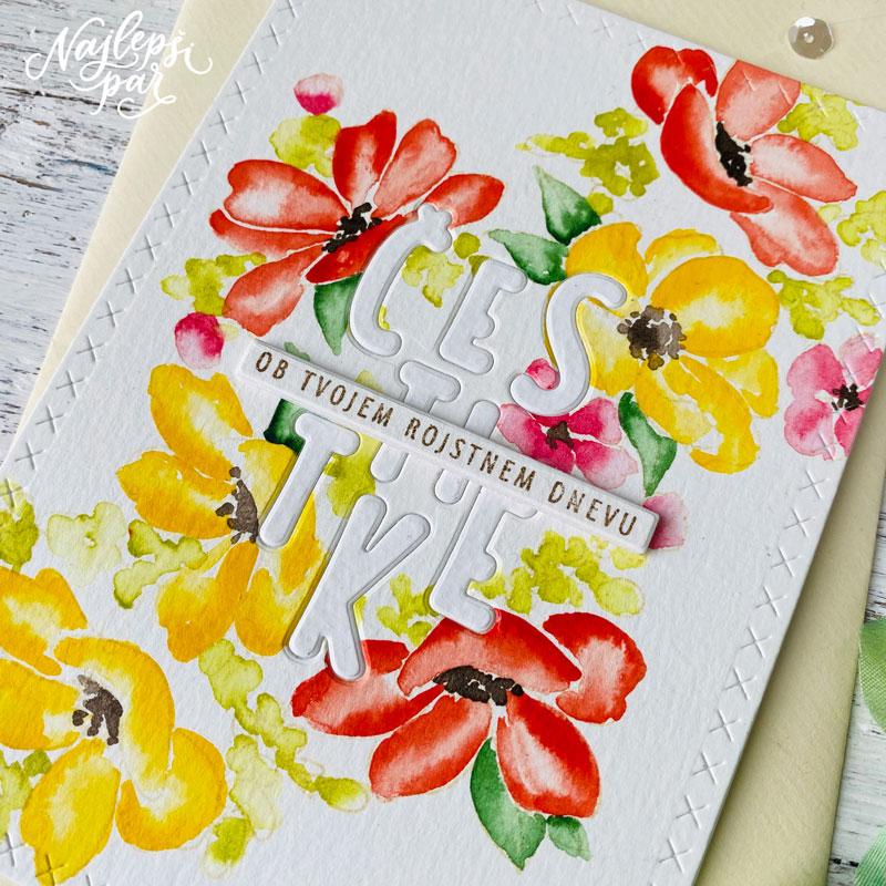 Danes z vami delim voščilnico, kjer sem aranžma iz kompleta Čestitke s cvetjem akvarelno pobarvala s tehniko brez črt.
