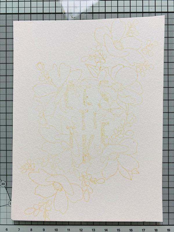 Veliko štampiljko sem odtisnila z Distress ink Antique linen blazinico in motiv spodaj in zgoraj še dodatno ‘raztegnila’ s cvetjem in listjem.