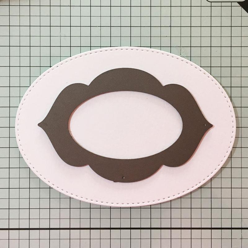 Okvir za marjetico sem pripravila iz belega ovala, v katerega sem (z najmanjšo šablono iz kompleta) izrezala še odprtino…kasneje pa sem dodala še valoviti okvir iz natur papirja.