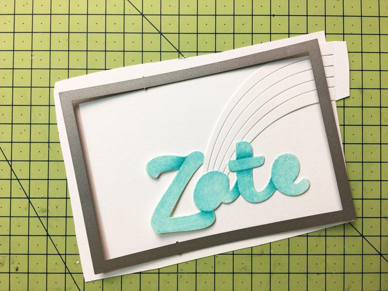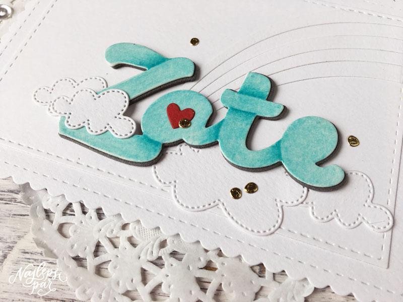 Besedo zate sem pobarvala s suhimi barvicami in otroškim oljem (v tej objavi vas čaka video in nekaj nasvetov o barvanju s to tehniko), nato pa sem izrezu dodala še izrez iz sive mos gume – za 3D učinek in nekaj temnejše sence, ki pomaga okrasiti belino. Na koncu so prišli na vrsto še oblaki, ki prav tako dodajo nekaj pestrosti.