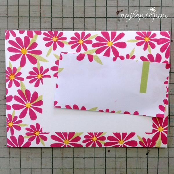 Ko sem imela pripravljen okvirček (tokrat manjši), sem velikost odprtine zamaskirala in na zunanji strani odtisnila marjetice. Velikost maskirnega pravokotnika sem pripravila na podlagi velikosti okvirčka.