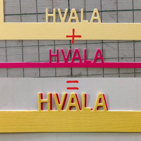 Da sem napis poudarila, pa sem iz pinki papirja izrezala še enega in ga zalepila iz hrbtne strani, pri tem pa sem ga nekoliko zamaknila (kot prikazuje enačba spodaj 🙂 ) Šablona, ki sem jo uporabila je iz kompleta Zahvala, a ko odrežemo črki ZA dobimo tudi preprosti in lepi HVALA!