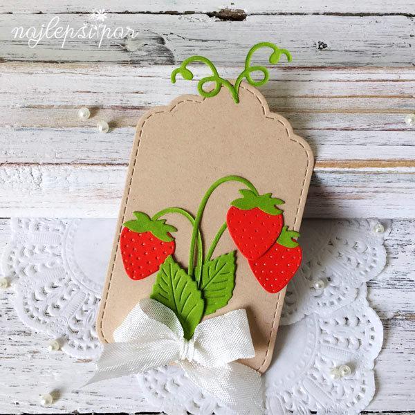 Danes začenjam z najbolj slastno izmed novosti…s kompletom rezalnih šablon Jagode, ki sem jih uporabila na voščilnici in tagu.