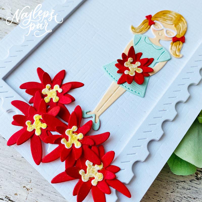 Čudovita voščilnica. Čisto sem se raznežila ob pogledu na deklico med cvetjem. Pa kako lepa očala ima! 🙂
