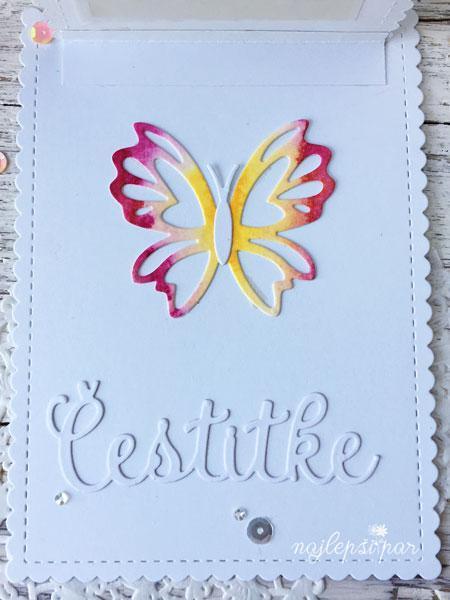 Majhne delce metulja sem zalepila čez odprtino na zunanji strani, glavni izrez pa na pripadajoče mesto v notranjosti. Tako kot metulj, se tudi voščilo popolnoma prekriva, saj sem beli izrez zalepila točno pod pisanega in se razkrije, ko ga privzdignemo.