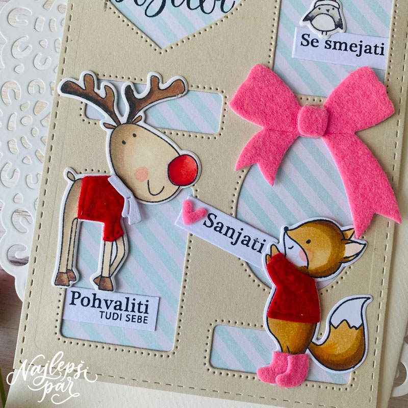 Tokrat se izziv glasi POZITIVČICA in nas vabi, da izdelamo voščilnico za hitro okrevanje z rožnato pentljo. Ker je lahko tudi praznična, sem se jaz odločila narediti eno razigrano novoletno voščilnico.