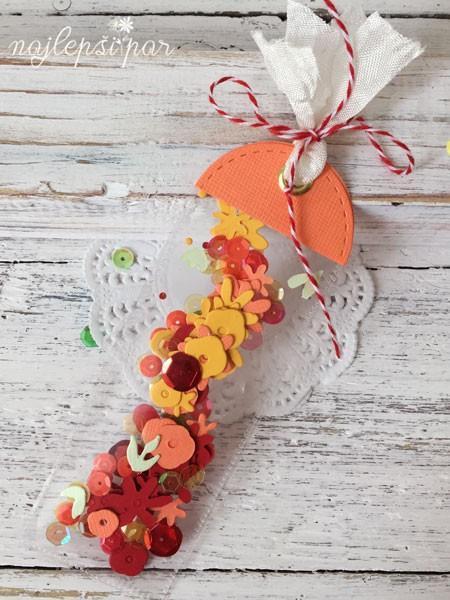 Takole izgleda pa tresočkasto knjižno kazalo, preden pristane na voščilnici – s Fuse napravo sem zavarila pravokotnik in ga napolnila z luskicami in drobnim cvetjem, nato pa sem izrezala krog, da prerezala na pol in z obema polovicama okrasila zgornji del.