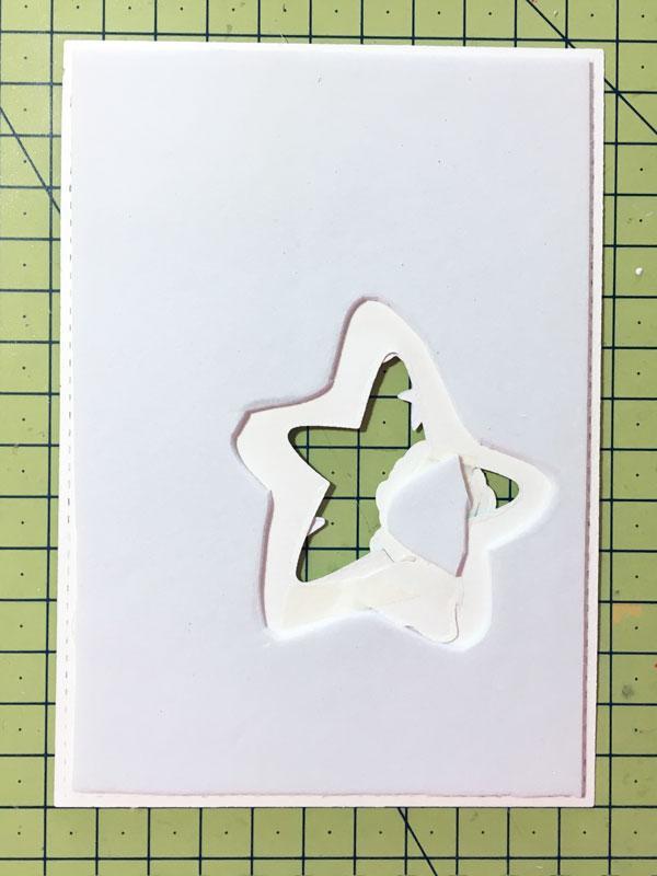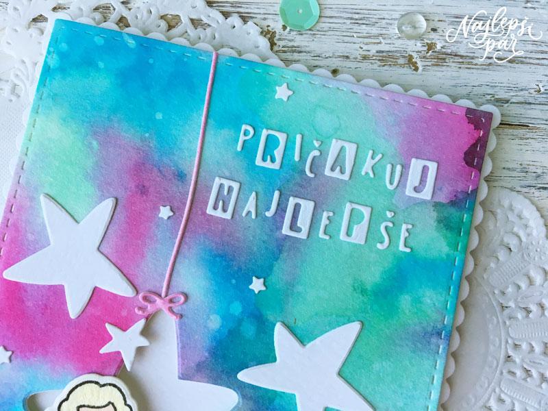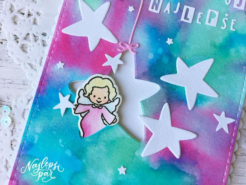 V pisani papir sem izrezala zvezdo, skozi katero je nato navihano pokukal angel in ulovil eno izmed padajočih zvezd. Za 3D učinek (da zvezdna odprtina z angelom pride lepše do izraza) sem tokrat uporabila mos gumo, tako bo voščilnica ohranila lepo obliko in ne bo postala vsa vijugasta še preden pride v prave roke.