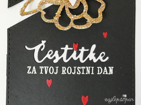 Tale voščilnica je nastala iz čistega navdušenja nad bleščicami, ki sem jih odkrila med zalogami, ko sem delala zlato jagodo. So malce posebne, ker imajo več barvnih odtenkov zlate in različno velike koščke… Zdelo se mi je, da bi bile super tudi na cvetu in tako se je začelo…